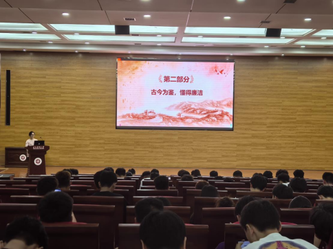 6月14日下午,太阳成集团tyc在新蒲校区道德讲堂开展清风颂廉主题教育会,公司党委副书记唐溢、员工党支部副书记吴培红、公司团委负责人刘超琪、辅导员谭芙英以及21级、22级、23级全体同学参会。