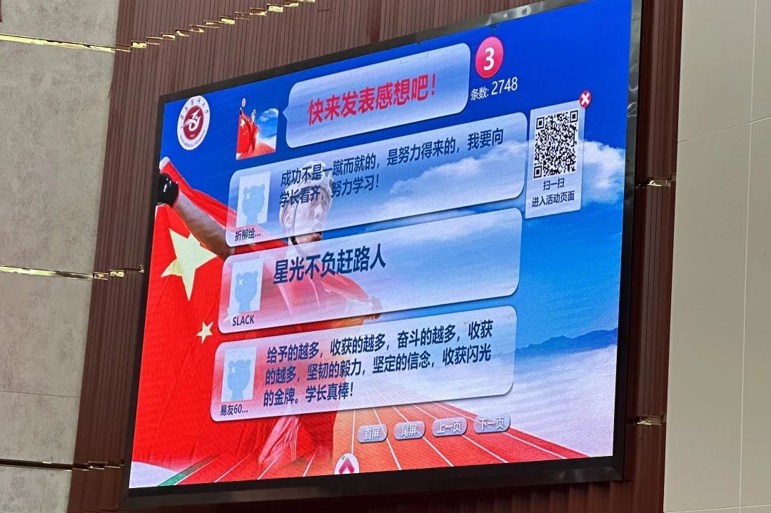 “很荣幸听到米久江师兄的讲座,米师兄的精神值得我们学习!激励着我们在未来的道路上更加努力奋斗!”“学长挥洒的汗水,使我成长!”“借你的光,我看见了从未看过的世界。”“只有不放弃,才能有奇迹。”“冠军,是日复一日的重复训练,攻坚克难造就的。好厉害,我要学习这样的精神”等等。