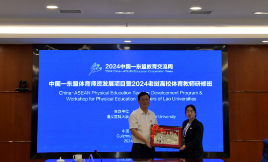 开班仪式最后,老挝国立大学运动科学与体育教育公司副经理西松普·通占(SISOMPHOUTHONGCHANH)向公司赠送具有老挝民族特色的纪念品并合影留念。