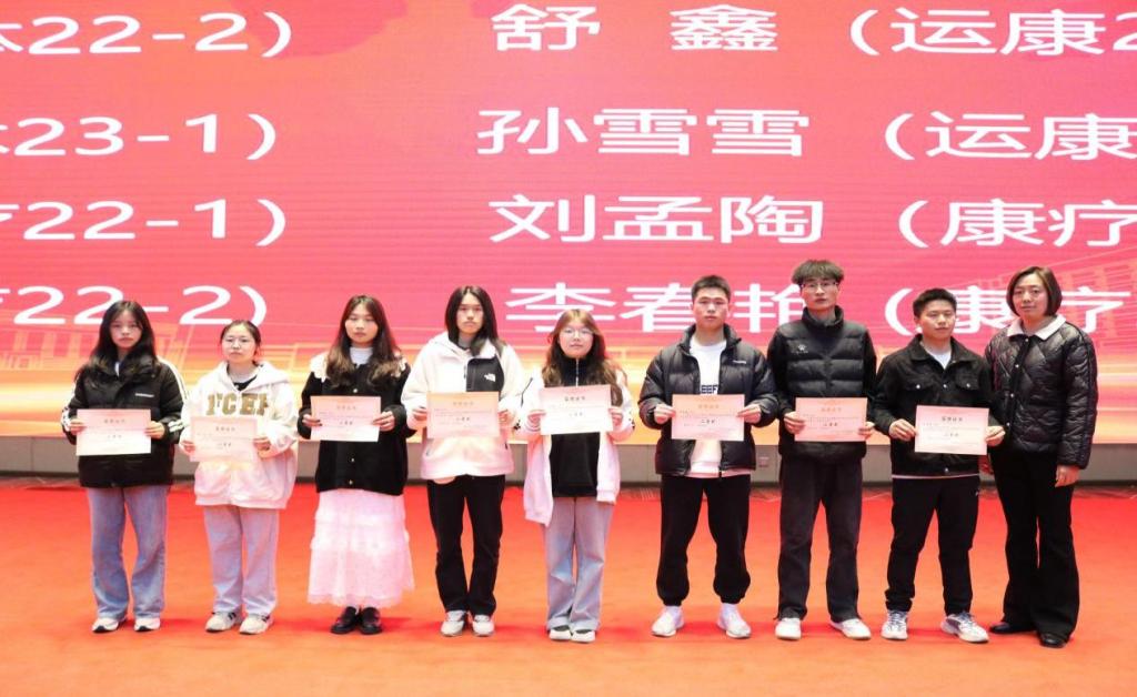 二等奖:杨胜学(社体22-2)、舒鑫(运康22-1)、孙浩(社体23-1)、孙雪雪(运康23-1)、邓世聪(康疗22-1)、刘孟陶(康疗23-3)、黄小芬 (康疗22-2)、李春艳 (康疗23-2)